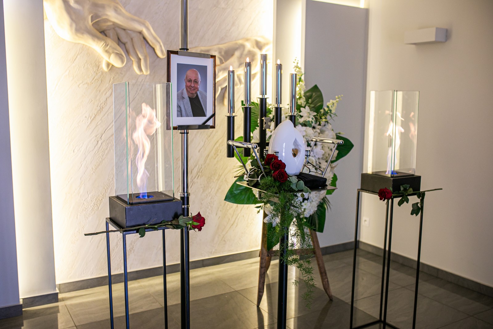 Centralne miejsce zajmuje katafalk na urnę, ozdobiony świecznikami, tworzący estetyczną i spójną oprawę. Po obu stronach urny ustawiamy do kompletu dwa stylowe świeczniki, które wprowadzają nastrój refleksji.